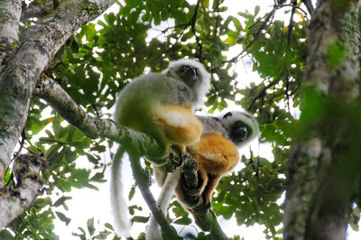 There are many groups of tourists taking pictures here. A bit further down in the park, close to their territorial boundary, we come across a group of 4 indri-indri lemurs, sitting and eating high up in the trees. These are the largest living lemurs in Madagascar. Because it is such great weather, we have good occasions to take pictures. While we are watching the group, they burst out in their well-known communicative sounds.... a very loud and unforgettable experience.