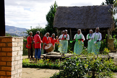 On the road further to the south we encounter groups of many hundreds of walking zebu cattle, on their way to the slaughterhouses in Antananarivo. Some of the animals make a 700km trip this way from the south of the country. We continue our trip until we arrive in a small city (Ambohimahasoa) where we park next to a protestant church. A table for 4 is made in the garden, and we have a Malagasy lunch there while the local people perform on a stage. One man plays a valiha, a traditional musical instrument. During the meal, Maxim plays soccer with some children. They are very proud to have a real leather ball, although it is broken. We are also invited to join in a traditional dance. All of the performers get their tips, that is the only income they have.