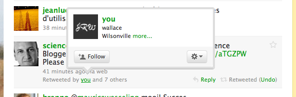Een foutje in de interface van twitter net na de introductie van de "retweet" functionaliteit. Nadat ik dit bericht heb geretweet zegt het systeem "retweeted by you and 7 others", maar "you" is blijkbaar een heel ander twitter account.... #oops #twitter